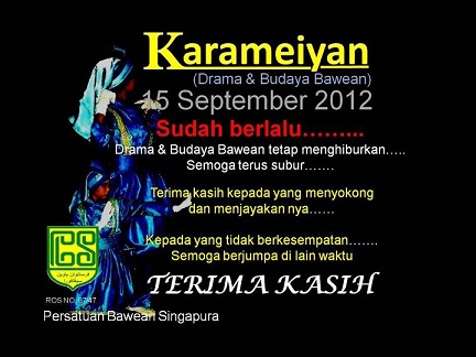 Alhamdulillah, pementasan "Karameiyan" anjuran Persatuan Bawean Singapura (PBS) telah berjalan dengan lancar dan jayanya sebagaimana yang telah dijadualkan pada 15hb September 2012. Persembahan drama dan budaya Bawean ini adalah sebahagian daripada usaha PBS untuk melestarikan dan memajukan warisan budaya dan bahasa Bawean, khususnya di kalangan masyarakat keturunan Bawean Singapura generasi muda hari ini.